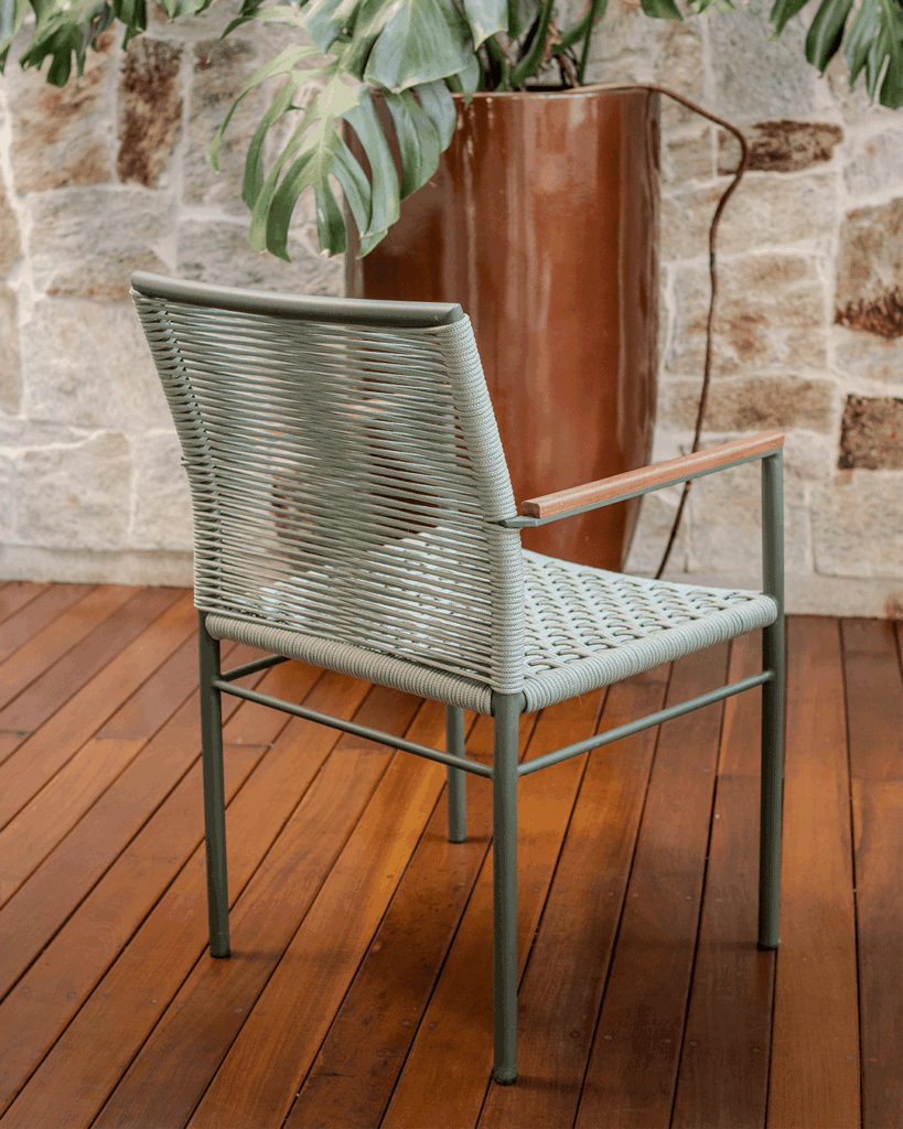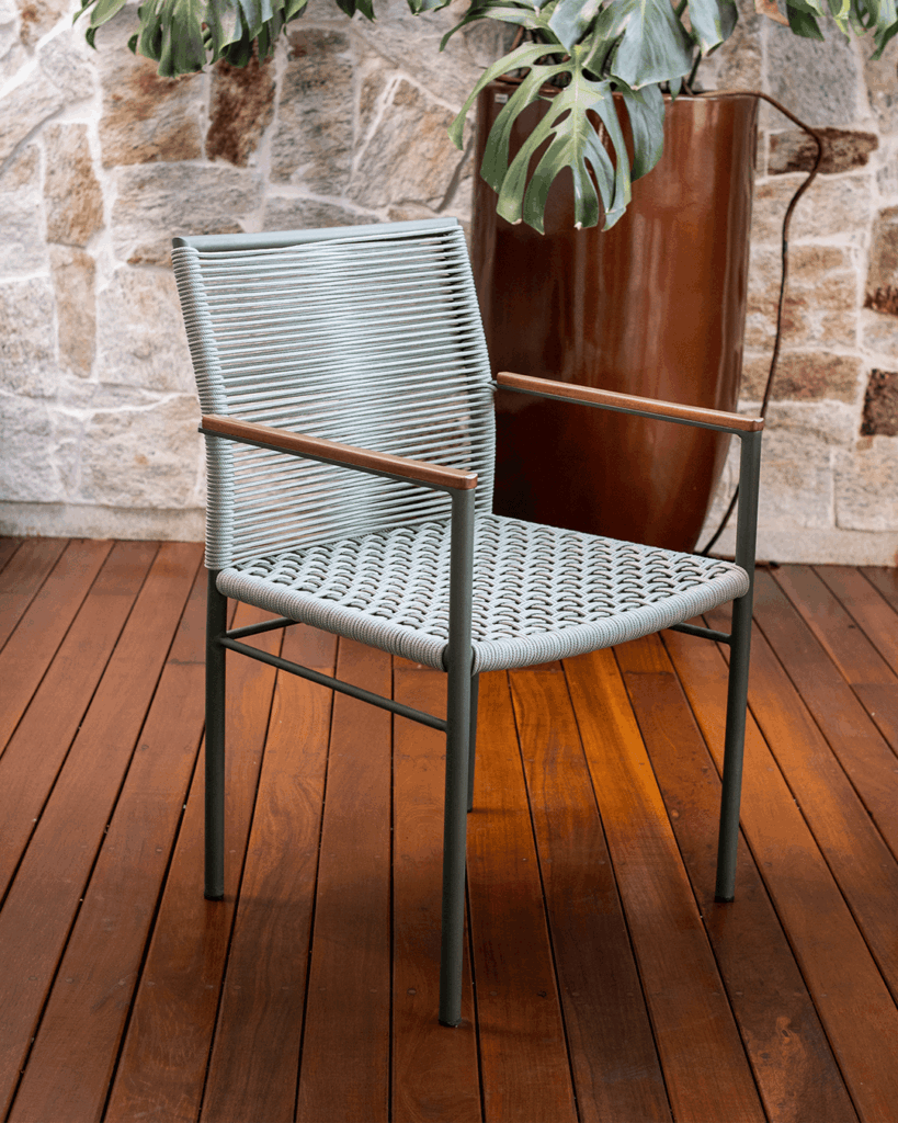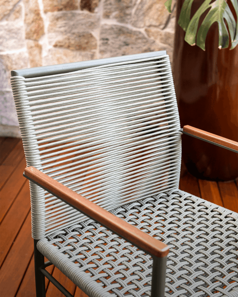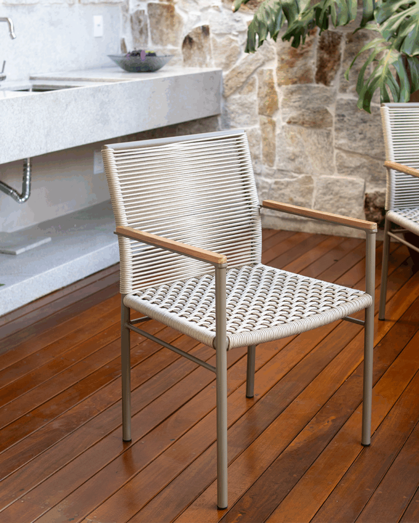 Material: Estrutura em alumínio com pintura eletrostática, revestido em corda náutica ou fibra sintética com proteção UV. Detalhe em madeira nos braços.