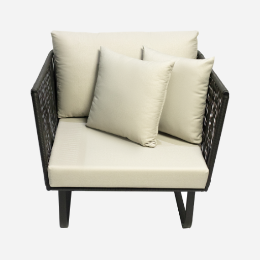 Material: Estrutura em alumínio com pintura eletrostática. Revestida em corda náutica ou fibra sintética com proteção UV. Almofada de assento/encosto em tecido acrílico.