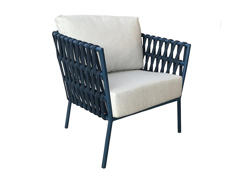 Material: Estrutura em alumínio com pintura eletrostática. Revestida em corda náutica ou fibra sintética com proteção UV. Almofada de assento/encosto em tecido acrílico.